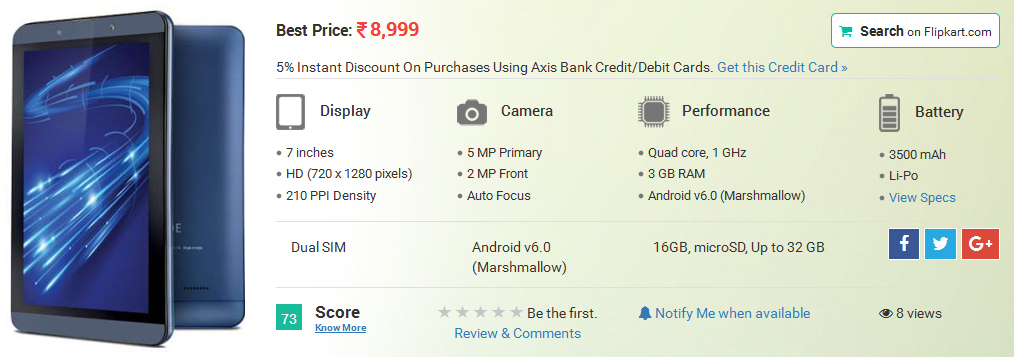 On the camera front, the iBall Slide Brisk 4G2 offers a 5MP primary rear camera with LED flash and autofocus features. Also, there is a 2MP front-facing camera for selfies and video calling. The connectivity options on the device include Wi-Fi, USB OTG, GPS, A-GPS, Bluetooth, and FM Radio. The sensor on board includes an accelerometer, proximity, gyroscope, and ambient light sensor. There is a 3500mAh battery on the rear which powers the iBall Slide Brisk 4G2 tablet.
