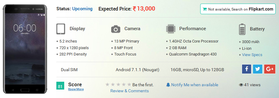 The Nokia 6 features a 5.5-inch full-HD display covered by 2.5D Gorilla Glass. It runs on Android 7.0 Nougat OS and is equipped with Qualcomm Snapdragon 430 processor. For photography, it has a 16MP rear camera along with an 8MP selfie camera. The phone has a 3000mAh battery.